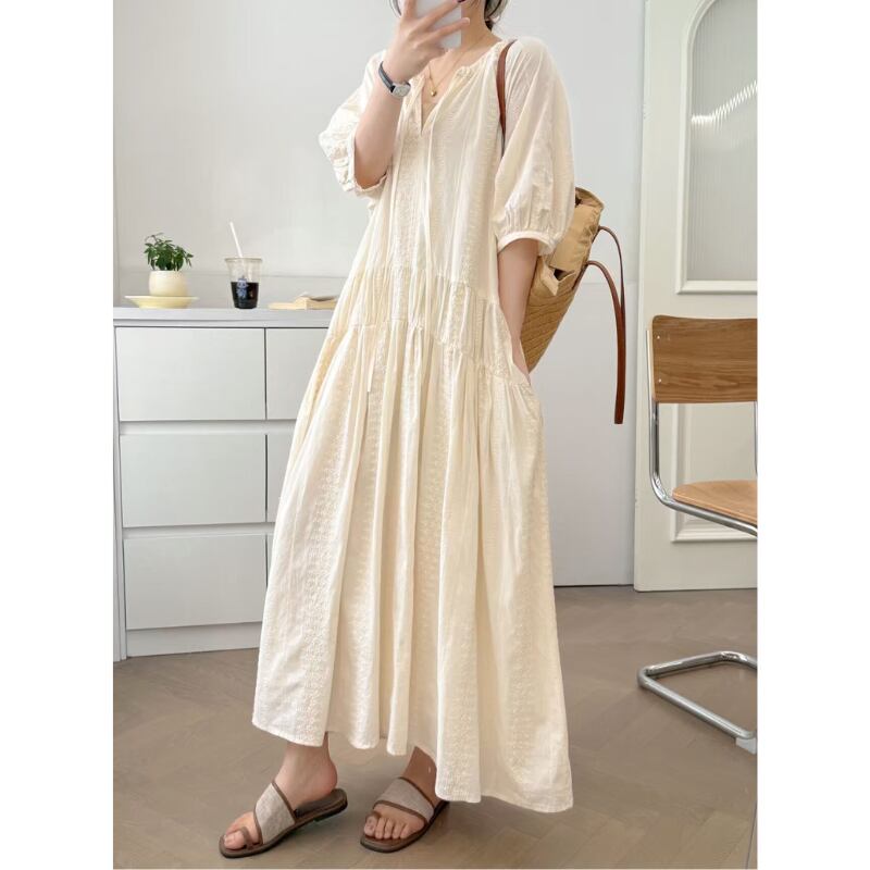 一枚でコーディネートが完成するVネックのロング丈ワンピース。ゆったりとしたシルエットが体型をカバーし、リラックス感のある着こなしを叶えます。普段使いはもちろん、リゾートシーンなどにも映える、幅広く活躍するアイテムです。