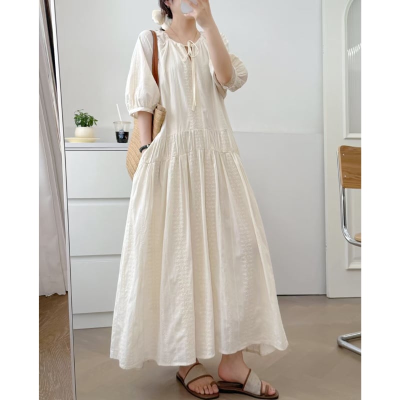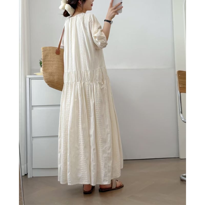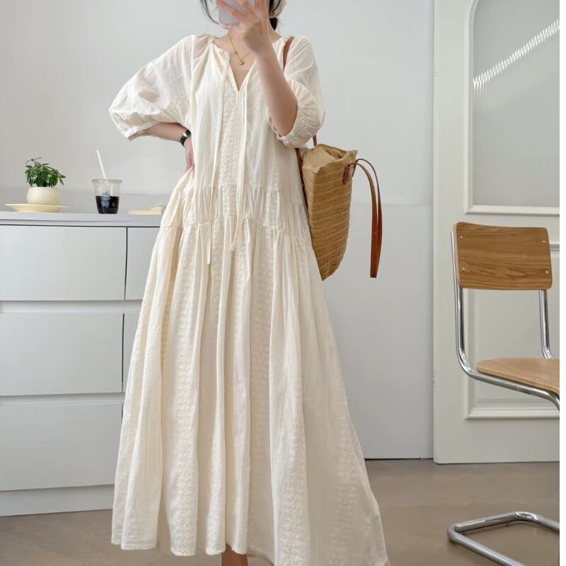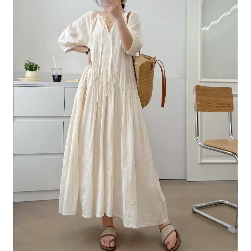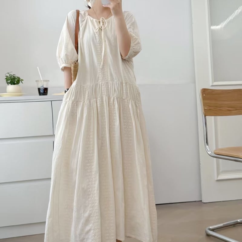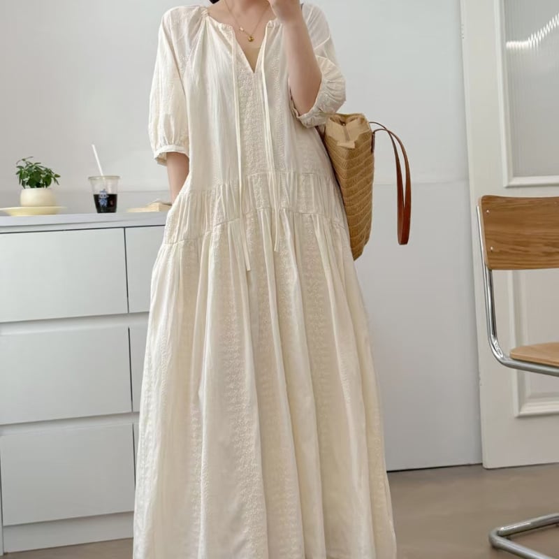 Vネック 紐付き ギャザー ロング丈 ワンピース 1col 1057