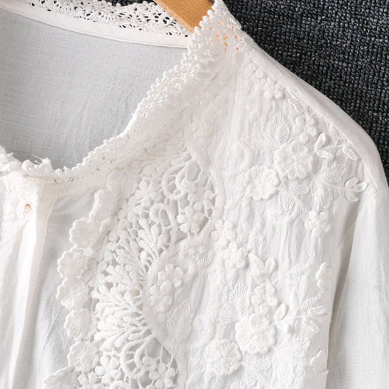フロントのレースがポイントのバンドカラーブラウスです。