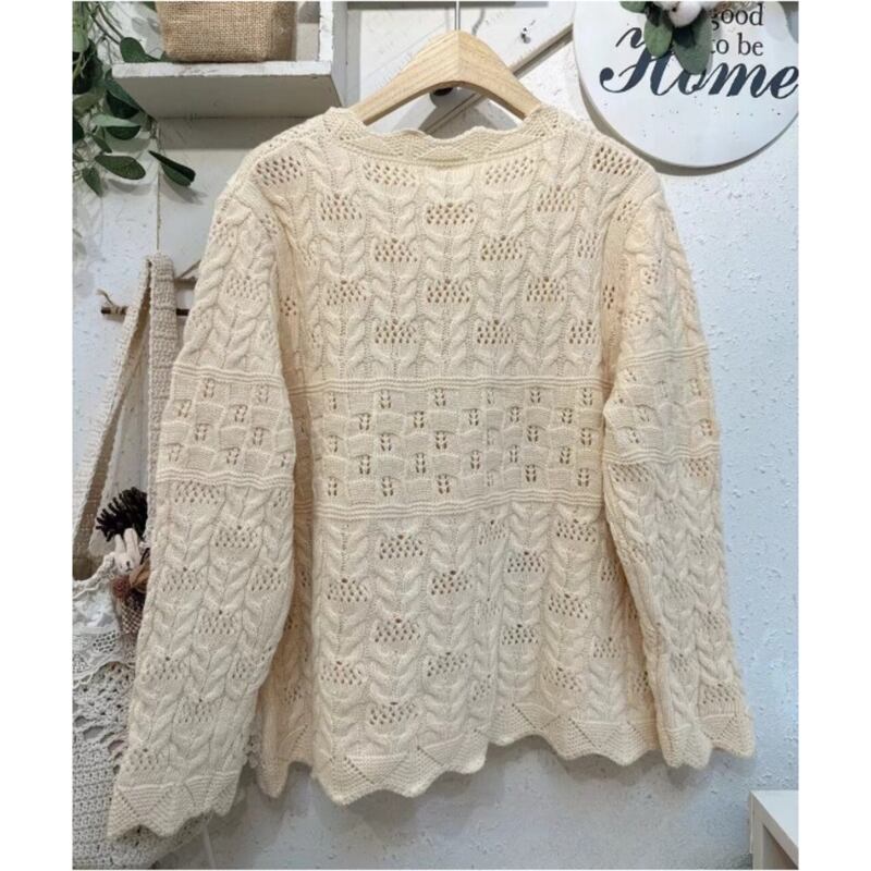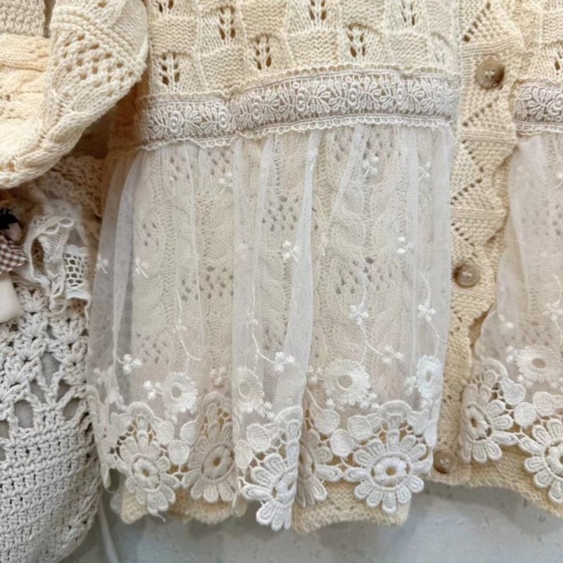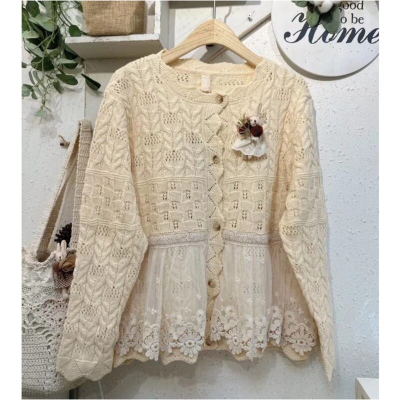 繊細なレース切り替えがフェミニンな印象のケーブル編みのニットカーディガンです。