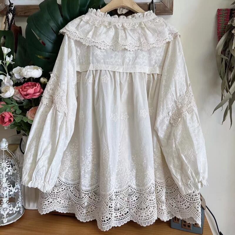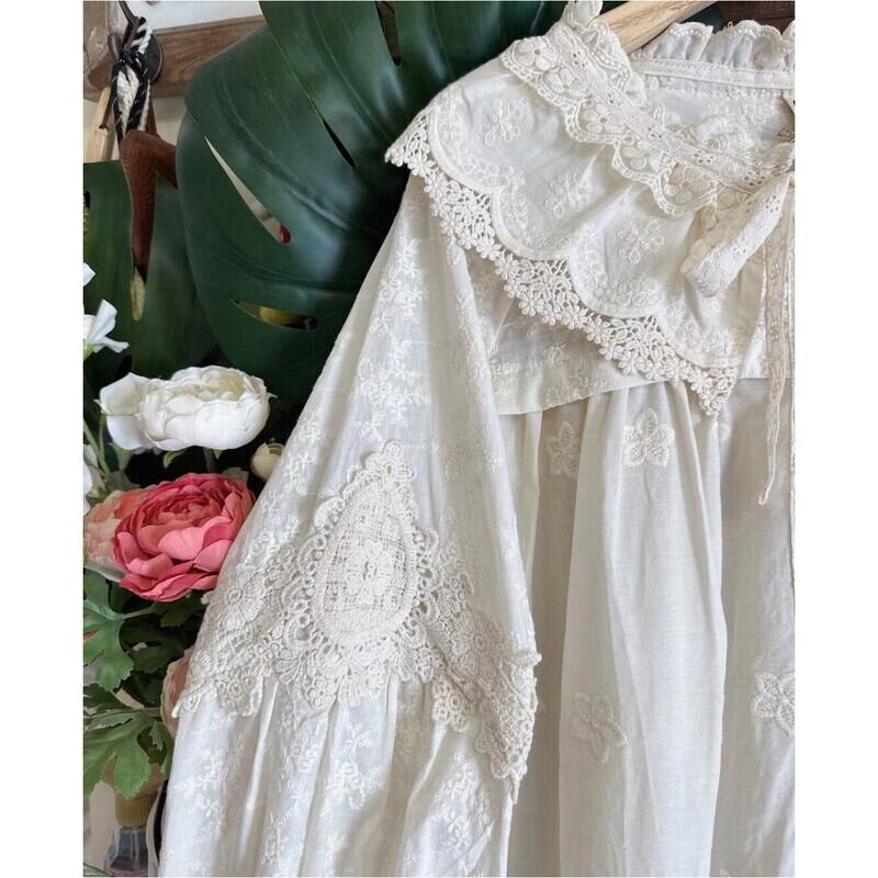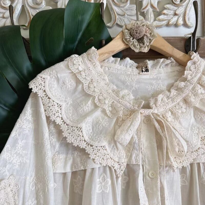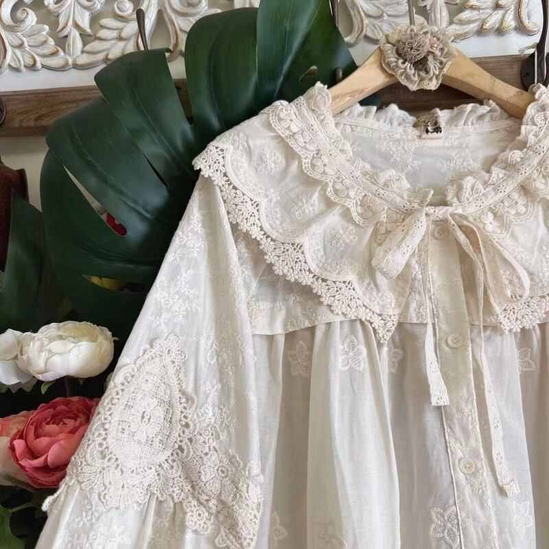 レース襟が顔周りを華やかに演出する長袖シャツブラウスです。