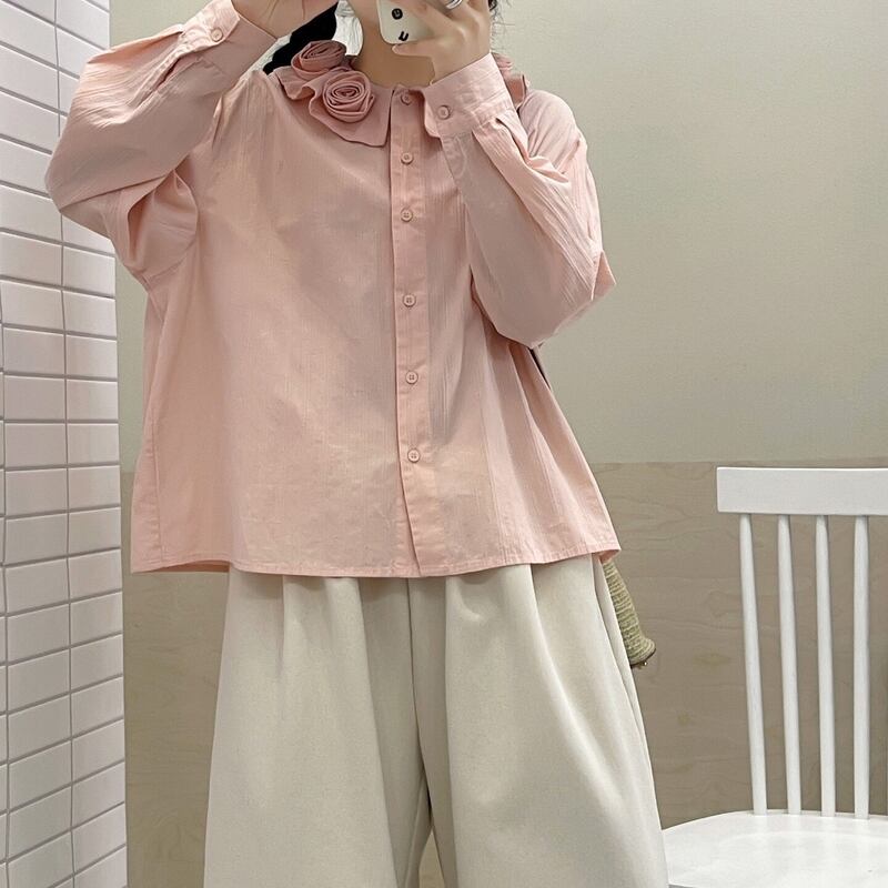 襟元のローズモチーフが目を惹く、着こなしのアクセントになる一枚。