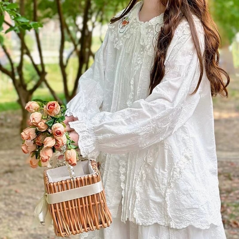 フリルをあしらった襟元が、顔周りを華やかに演出。